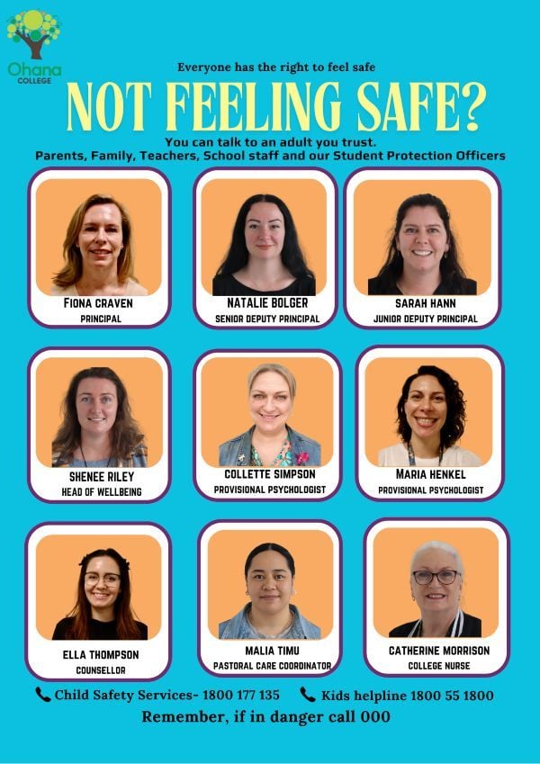 At Ohana College, wellbeing is our primary focus every day. There are a variety of support staff that advocate, support and encourage students to engage positively with their learning, peers and community. All staff endeavour to build positive relationships with students as a core component of student engagement.